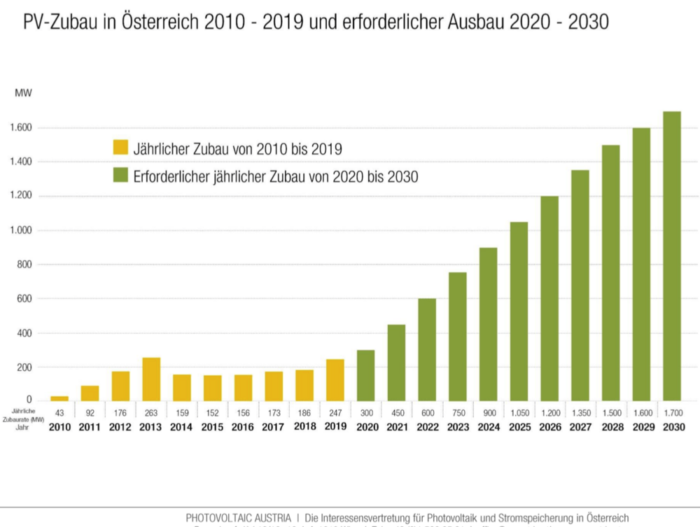 Ein Lichtblick im wahrsten Sinn des Wortes: Die Nachfrage nach Photovoltaik-Anlagen ist in den letzten Jahren kontinuierlich gestiegen und soll, lt. Prognosen der „Photovoltaik Austria“ in den kommenden Jahren noch stärker ansteigen, wie nachfolgende Grafik zeigt.